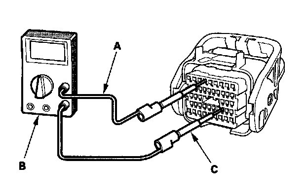 6. Connect one side of the patch cord (A) terminals to a commercially available digital multimeter (B), and connect the other side of the patch cord terminals to a commercially available banana jack (Pomona Electronics Tool No.3563 or equivalent) (C).
