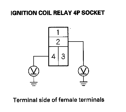 3. Measure the voltage between ignition coil relay 4P socket terminal No.2 and body ground, then terminal No.4 and body ground.