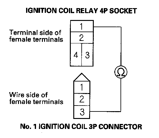 4. Check for continuity between ignition coil relay 4P socket terminal No.1 and the No.1 ignition coil 3P connector terminal No.3.