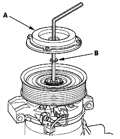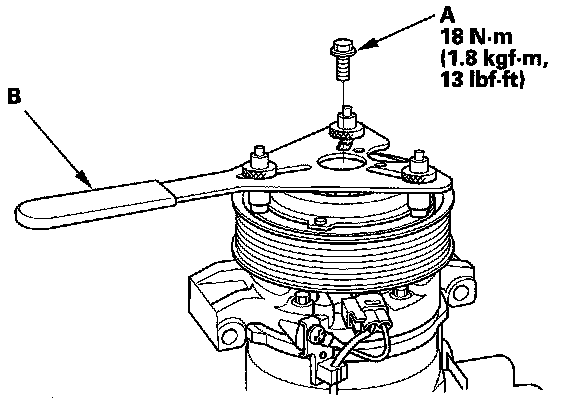 1. Remove the center bolt (A) while holding the pressure plate with a commercially available A/C clutch holder (B).