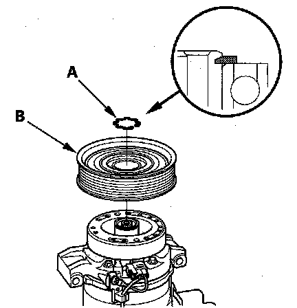3. If you are replacing the field coil, remove the snap ring (A) with snap ring pliers, then remove the rotor pulley (B). Be careful not to damage the rotor pulley and A/C compressor.