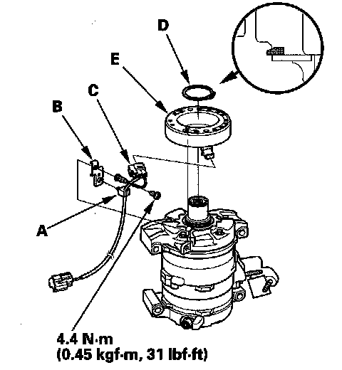 4. Remove the screw, the wire harness clip (A), and holder (B), then disconnect the field coil connector (C). Remove the snap ring (D) with snap ring pliers, then remove the field coil (E). Be careful not to damage the field coil and A/C compressor.