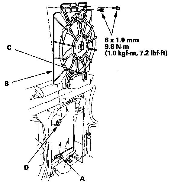 9. Remove the A/C compressor clutch connector (A) from the A/C condenser fan shroud (B), then open the wire harness clip. Disconnect the A/C condenser fan connector (D). Remove the upper mounting bolts and the A/C condenser fan shroud. Be careful not to damage the radiator fins when removing the A/C condenser fan shroud.
