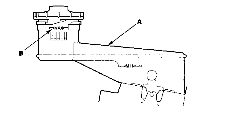 1. Make sure the brake fluid level in the reservoir (A) is at the MAX (upper) level line (B).