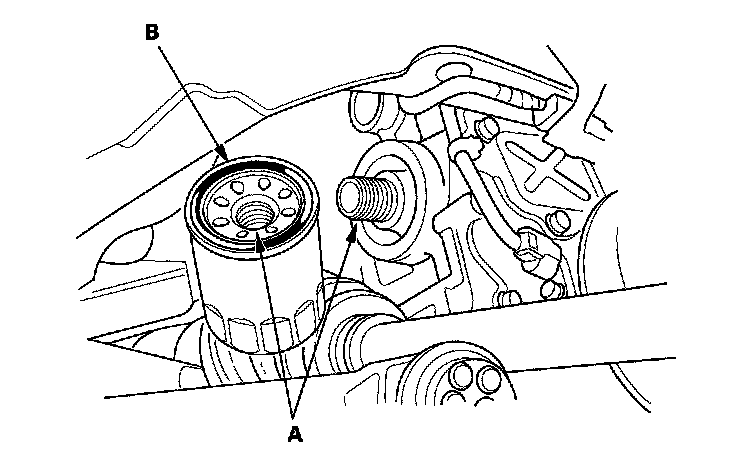 2. Inspect the threads (A) and rubber seal (B) on the new filter. Clean the seat on the engine block, then apply a light coat of new engine oil to the filter rubber seal. Use only filters with a built-in bypass system.