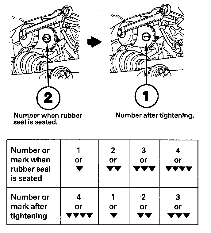 ^ Spin the filter on until its seal lightly seats against the block, and note which number or mark is at the bottom.