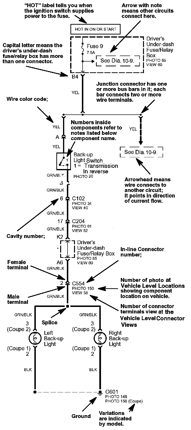 All in-line and junction connectors are numbered (C725, C416, etc.). Component connectors are not numbered but are identified either by the name of the component if the component only has one connector, or by a capital letter (A, B, C, etc.) if the component has more than one connector.