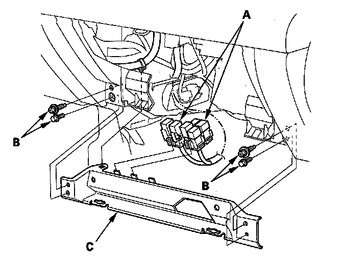 12. Remove the relays (A), then remove the bolts (B) and the glove box frame (C).