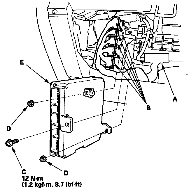 16. Remove the nuts (D), then remove the ECM/PCM (E).