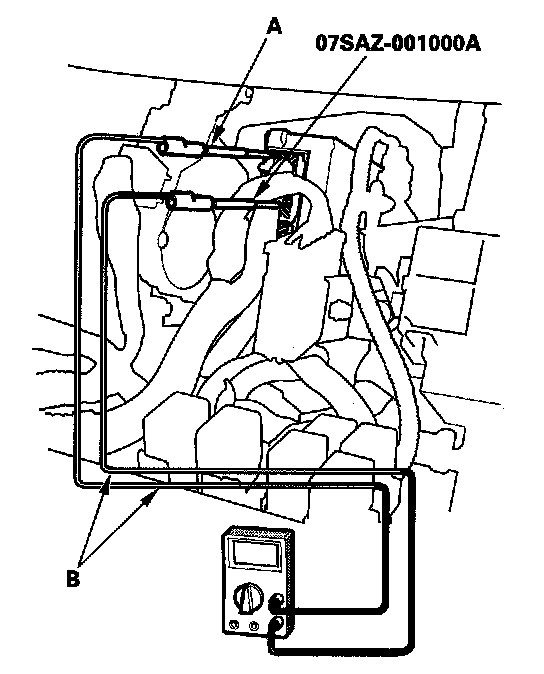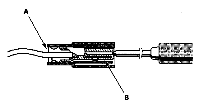 3. If you cannot get to the wire side of the connector or the wire side is sealed (A), disconnect the connector and probe the terminals (B) from the terminal side. Do not force the probe into the connector.