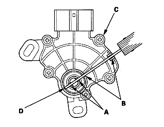 7. Align the cutouts (A) on the rotary-frame with the neutral positioning cutouts (B) on the transmission range switch (C), then put a 2.0 mm (0.08 in.) feeler gauge blade (D) in the cutouts to hold the switch in the N position.