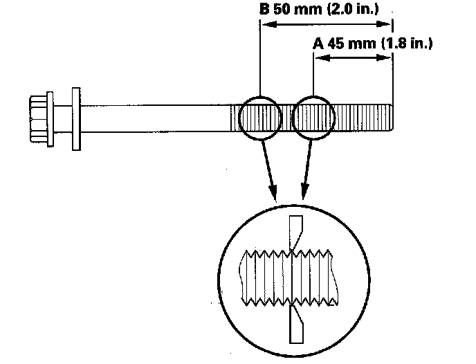 If either diameter is less than 10.6 mm (0.42 in.), replace the cylinder head bolt.