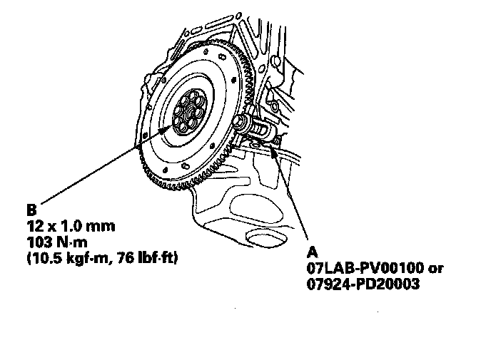 Torque the flywheel mounting bolts (B) in a crisscross pattern in several steps.