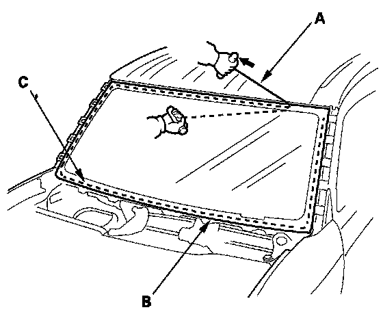 6. With a helper on the outside, pull the piano wire (A) back and forth in a sawing motion. Hold the piano wire as close to the windshield (B) as possible to prevent damage to the body and dashboard. Carefully cut through the rubber dam and adhesive (C) around the entire windshield.