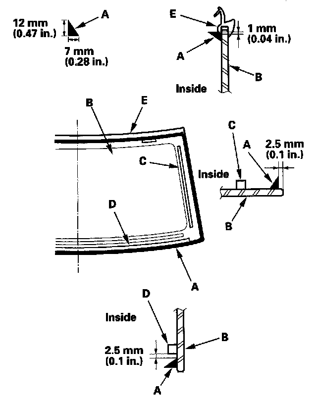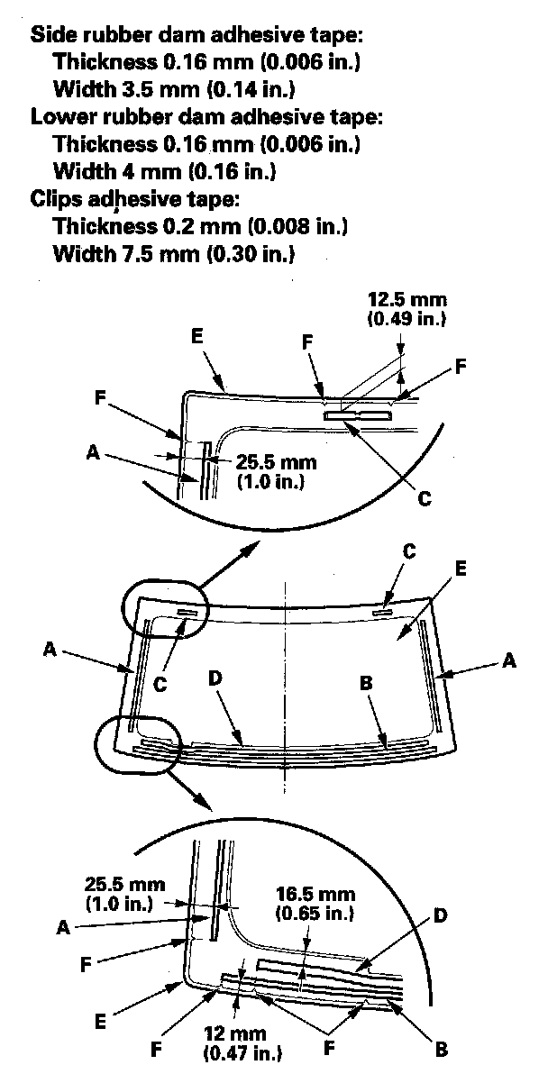 11. Attach the side rubber dam (A), lower rubber dam (B) with adhesive tape. Attach the clips (C) with adhesive tape and dashboard seal (D) to the inside face of the windshield (E) as shown: