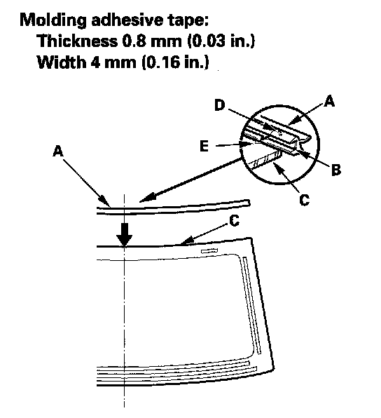 - Be sure the alignment mark (D) of the molding lines up with the alignment mark (E) of the windshield.