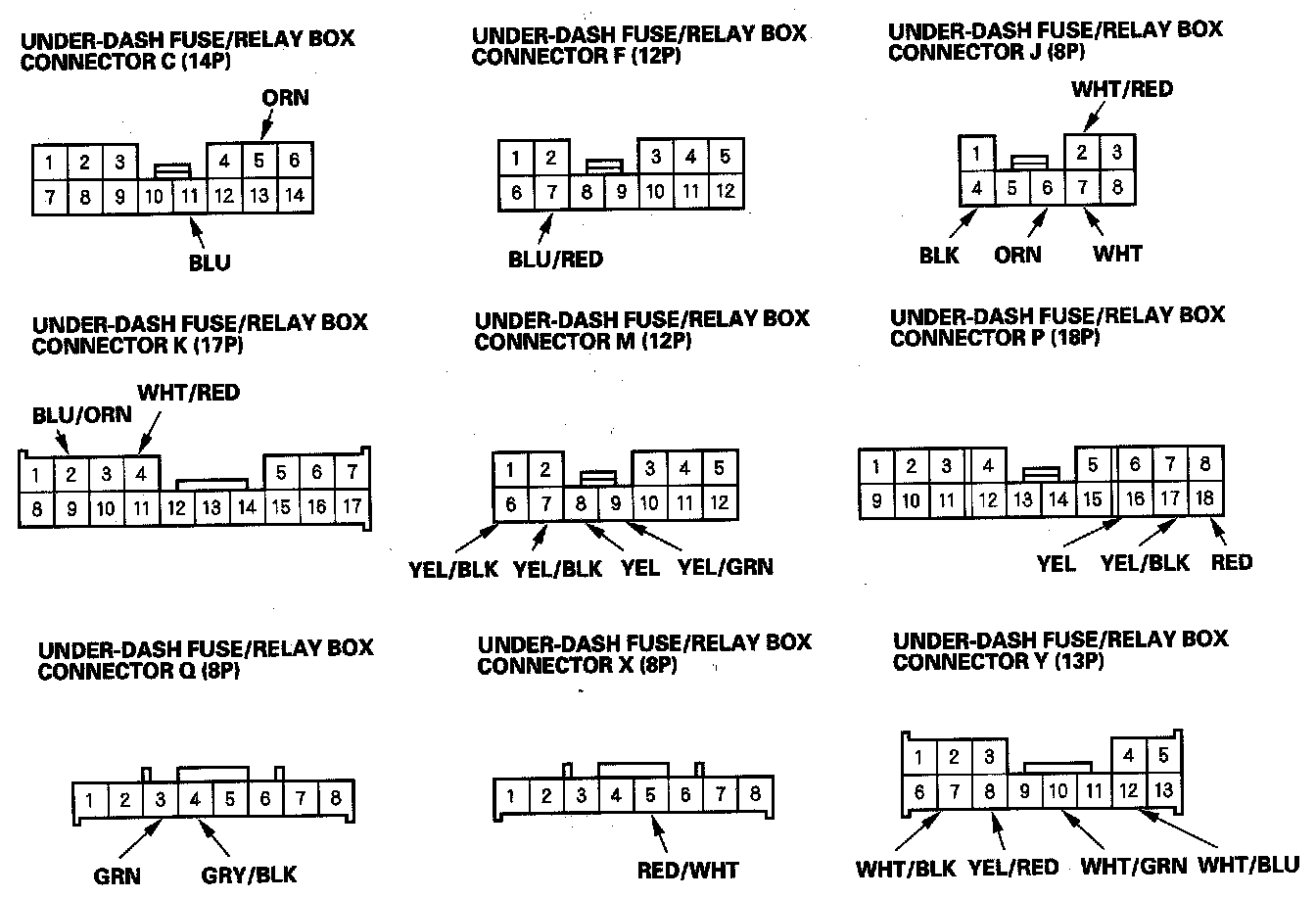 4. Reconnect all connections to the under-dash fuse/relay box, and make these input tests at the appropriate connectors on the under-dash fuse/relay box.