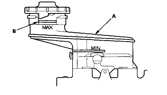 1. Make sure the brake fluid level in the reservoir (A) is at the MAX (upper) level line (B).
