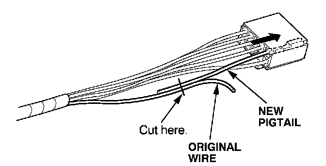 6. Lay the pigtail and the original wire side-by-side, and cut off both ends at once. If you are making more than one splice, do not cut each pigtail at the same location; the resulting "lump" of splice connectors would interfere with rewrapping the harness. Instead, cut the first pigtail close enough to the terminal so you will have room to make each remaining cut about 20 mm (3/4 inch) farther down on the next pigtail.