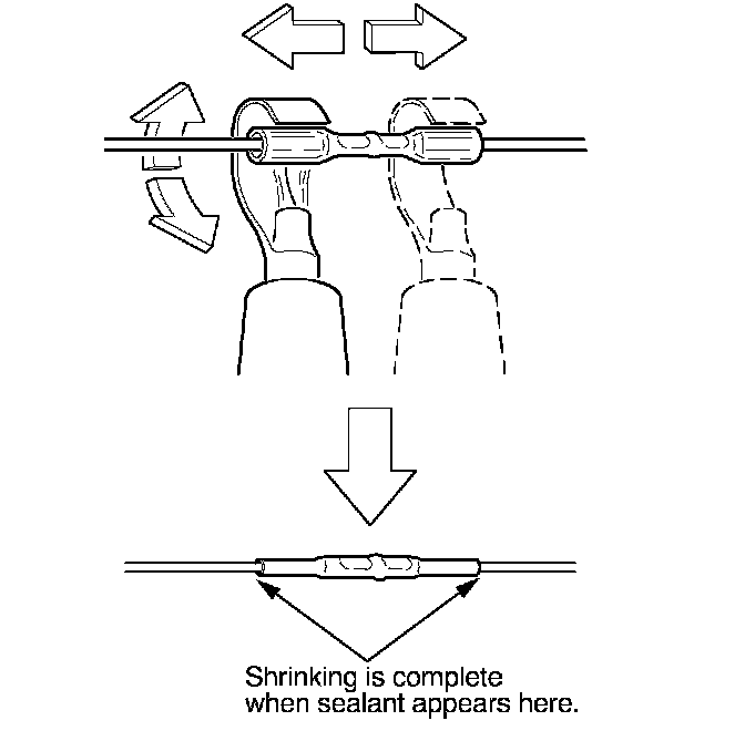 13. Plug in the heat gun, and turn it on. Start at the middle of the splice connector, and move the gun toward the ends as the tube shrinks. Apply heat evenly by rotating the curved heat spreader around the splice connector. Shrinking is complete when a small amount of sealant appears at each end of the tube.