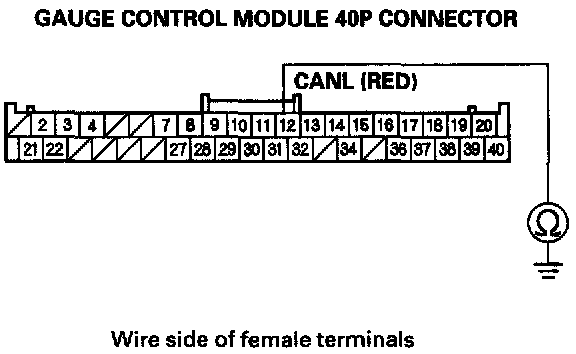 13. Check for continuity between gauge control module 40P connector terminal No. 12 and body ground.