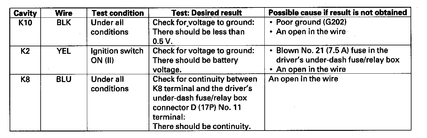 4. Reconnect the connector to the under-hood fuse/relay box, and make these input tests at the connector.