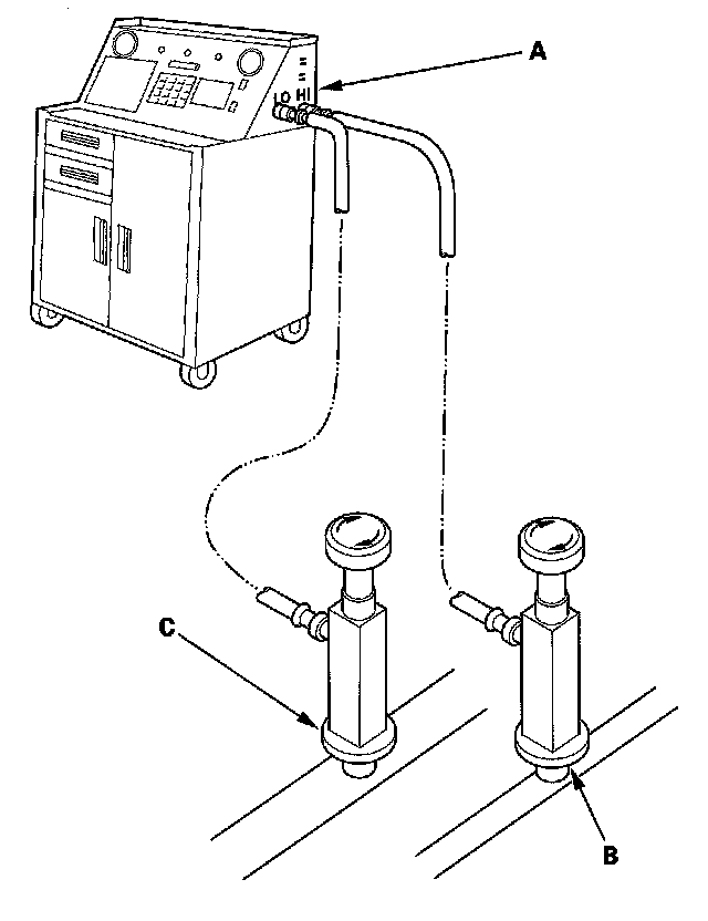 1. Connect an R-134a refrigerant recovery/recycling/charging station (A) to the high-pressure service port (B) and the low-pressure service port (C), as shown, in the equipment manufacturer's instructions.