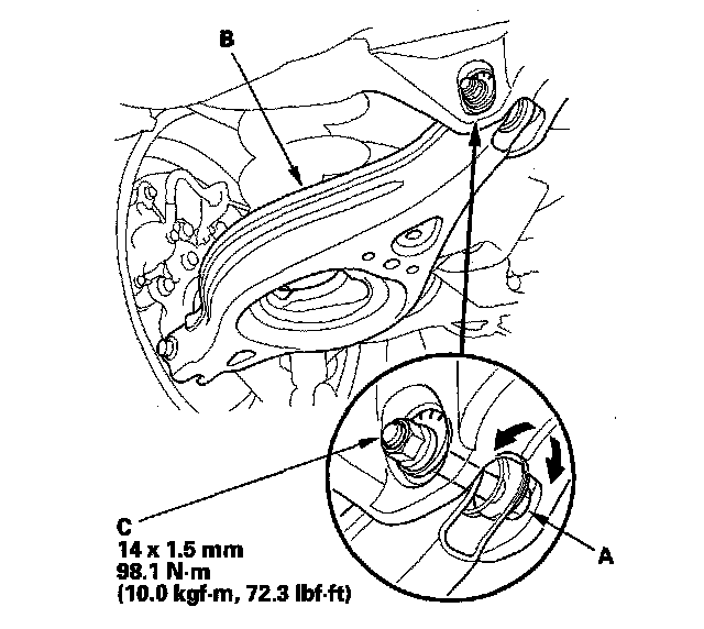 3. Hold the adjusting bolt (A) on the rear lower arm B, and remove the self-locking nut (C).