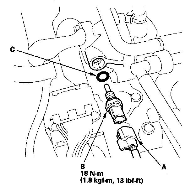 5. Install the parts in the reverse order of removal with a new O-ring (C), then refill the radiator with engine coolant, and bleed air from the cooling system with the heater valve open.