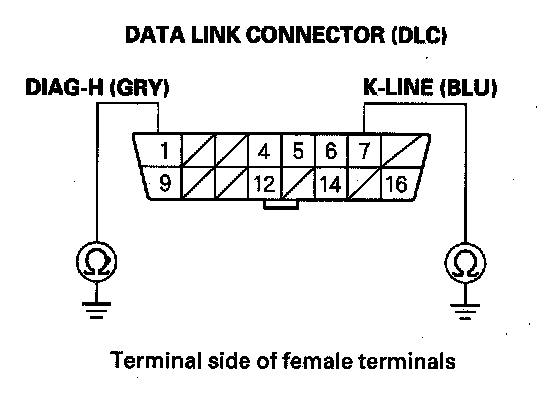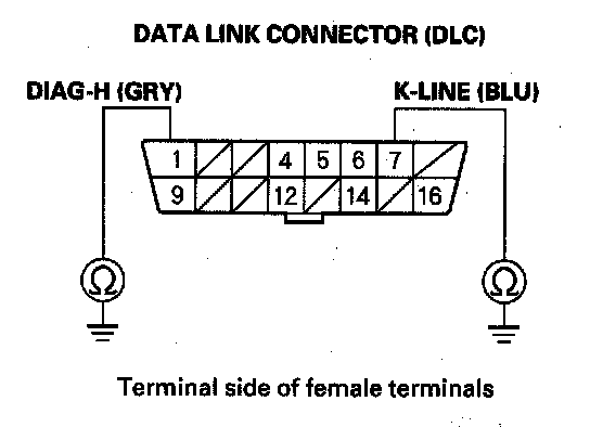 16. Check for continuity between body ground and DLC terminals No. 1 and No. 7 individually.