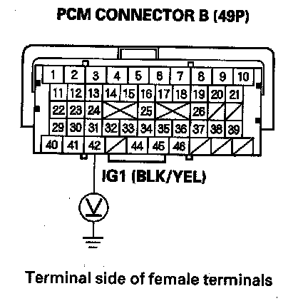 60. Measure voltage between PCM connector terminal B42 and body ground.