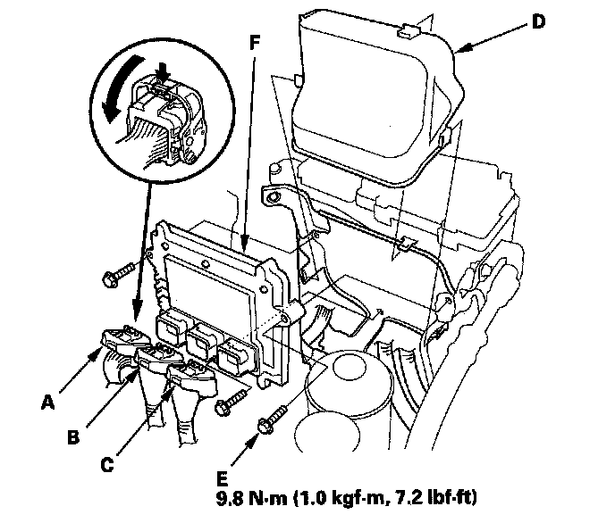 NOTE: PCM connector A, B, and C have symbols (A[], B=/\, C=0) embossed on them for identification.