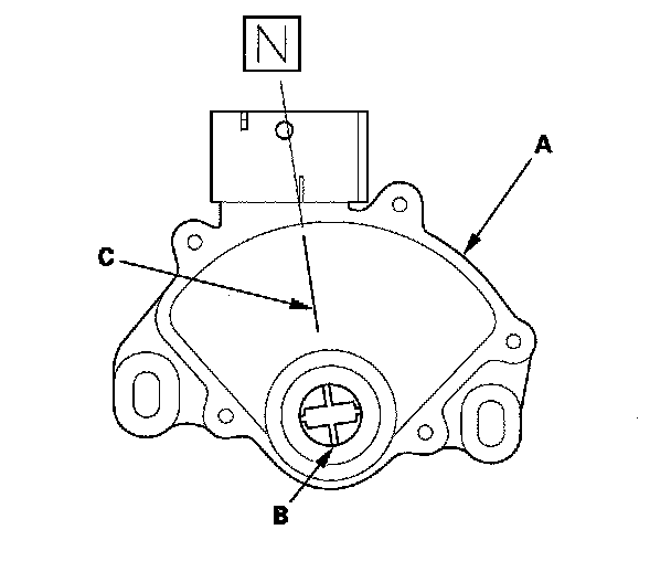 12. Set the new transmission range switch (A) to the N position. The transmission range switch clicks in the N position, and the selector control shaft hole (B) aligns with the N position line (C).