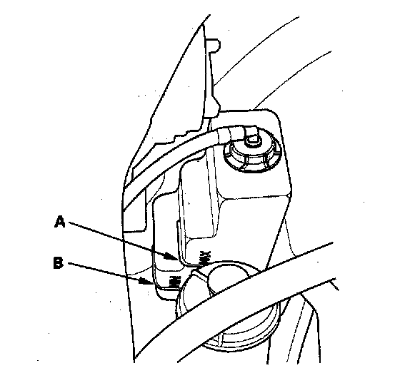 Coolant Check1. Look at the coolant level in the coolant reservoir. Make sure it is between the MAX mark (A) and MIN mark (B).