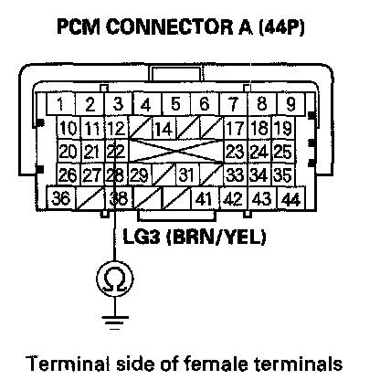 7. Check for continuity between PCM connector terminal A22 and body ground.