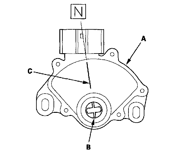 12. Set the new transmission range switch (A) to the N position. The transmission range switch clicks in the N position, and the selector control shaft hole (B) aligns with the N position line (C).