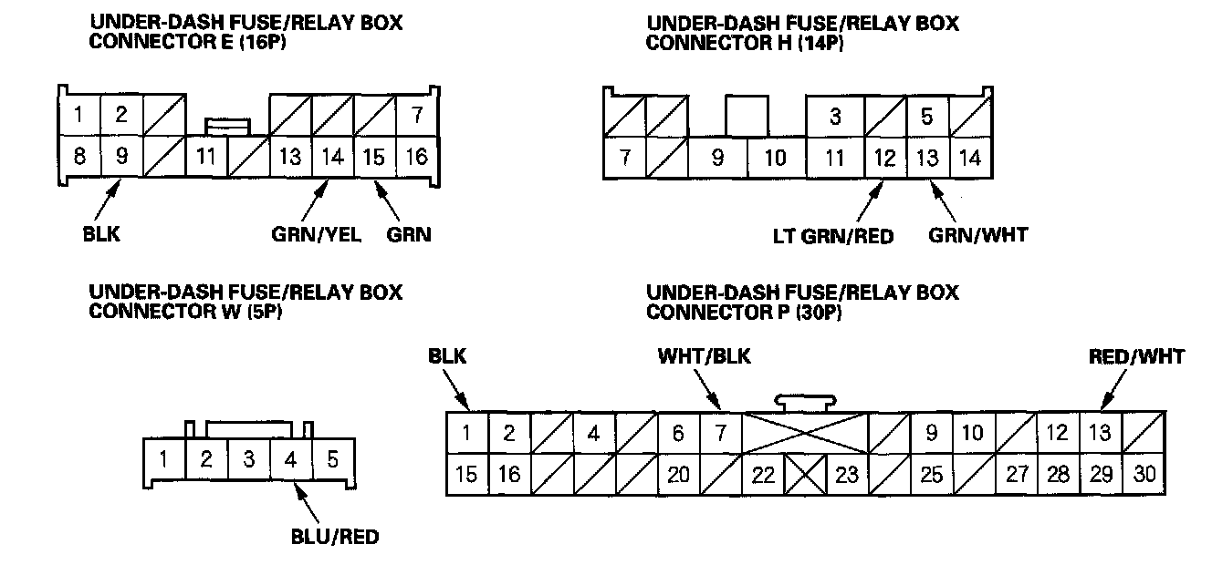 6. Reconnect the connectors to the under-dash fuse/relay box. Turn the ignition switch ON (II), and make these input tests at the appropriate connectors on the under-dash fuse/relay box.