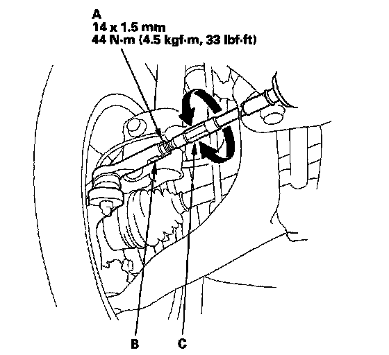 3. Loosen the tie-rod locknuts (A) while holding the flat surface sections (B) of the tie-rod end with a wrench, and turn both tie-rods (C) until the front toe is within specifications.