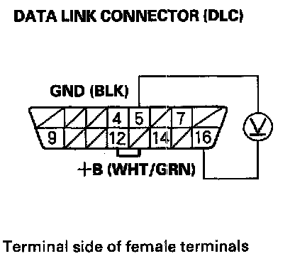 3. Measure voltage between DLC terminals No. 5 and No. 16.