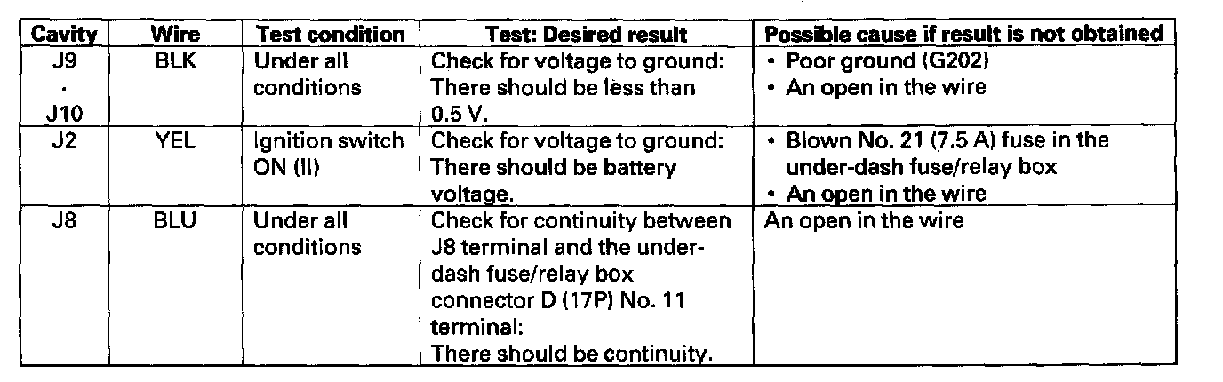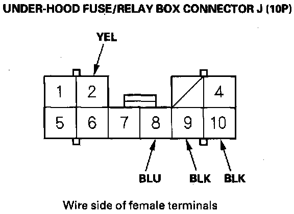 7. Reconnect the connector to the under-hood fuse/relay box, and make these input tests at the connector.