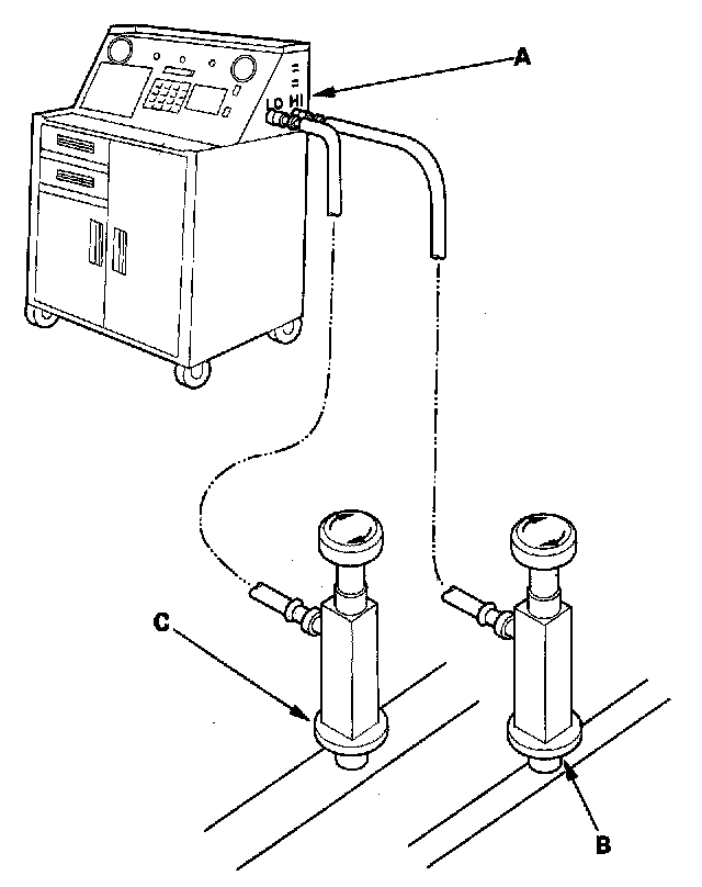 2. Connect, an R-134a refrigerant recovery/recycling/charging station (A) to the high-pressure service port (B) and the low-pressure service port (C), as shown, following the equipment manufacturer's instructions. Evacuate the system.