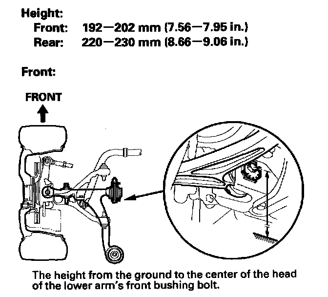 7. Check the ride height of each suspension. Make sure the vehicle is empty, is parked on a level surface, and has properly inflated tires (the treadwear indicator must not be showing). If the height is out of specification, adjust the load as necessary.