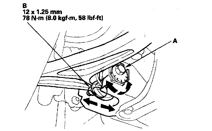 2. Hold the adjusting bolt (A) on the control arm, and loosen the self-locking nut (B).