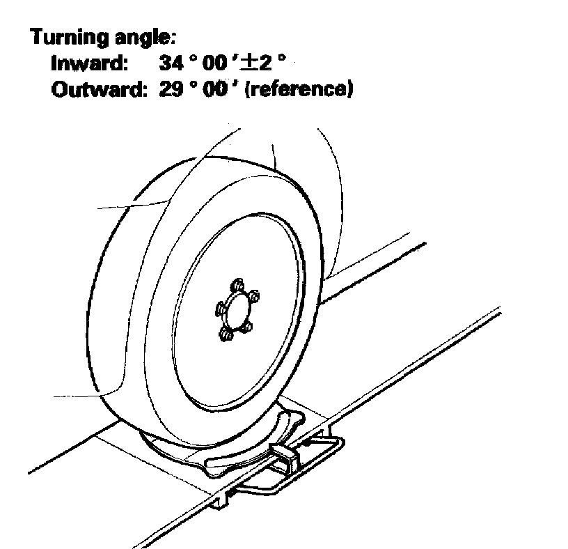 2. If the turning angles are out of specification or the inward turning angles differ between the right and left, check the toe, and adjust accordingly.