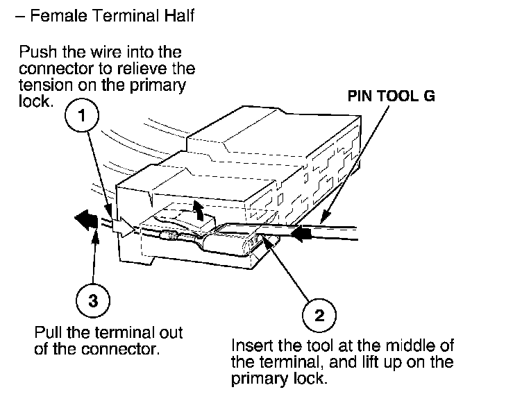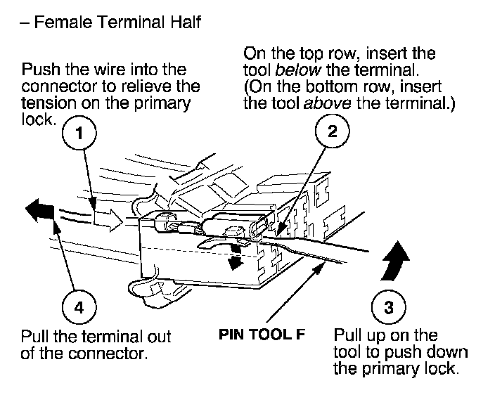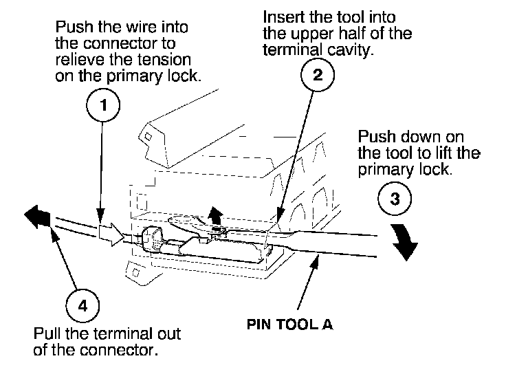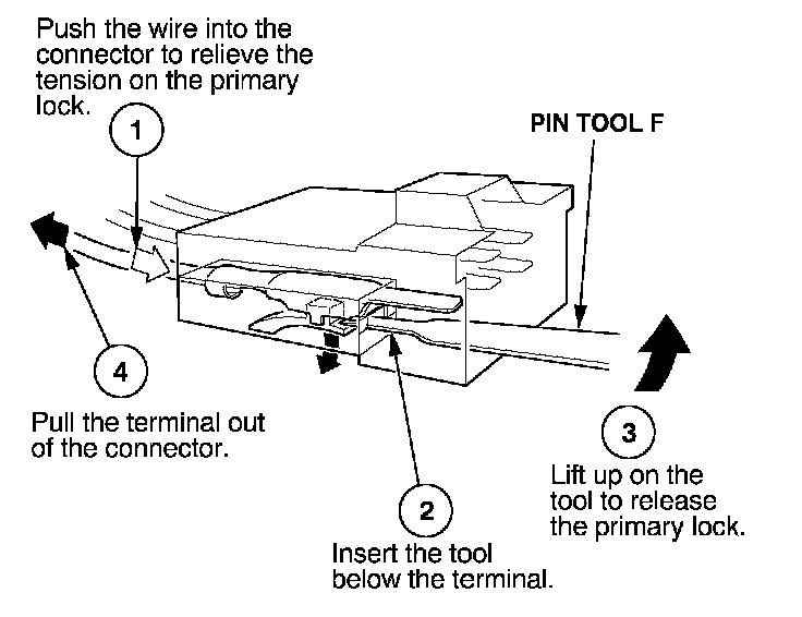 Before you begin, inspect the wire you are about to repair for damage and length. Make sure the wire will be long enough to make a terminal repair without stretching it when you reinstall the terminal in the connector. If the wire is too short, or if access to the connector is too restricted to make a terminal repair, you may need to install a pigtail terminal (a short length of wire with a factory-crimped terminal on it).