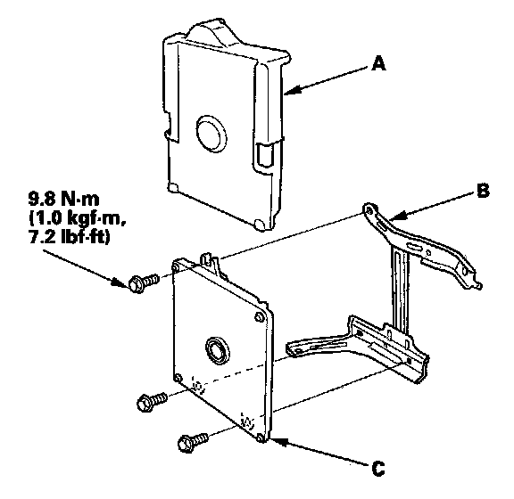 14. Remove the cover (A) and the bracket (B) from the ECM/PCM (C).