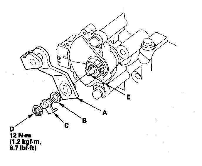 14. Install the new lock washer (A) over the control shaft (B) while aligning the projection (C) of the lock washer with the N positioning line (D) on the transmission range switch (E), and install the locknut (F).