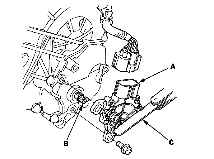 7. Install the transmission range switch (A) gently on the selector control shaft (B) while holding it in the N position with the 2.0 mm (0.08 in.) blade (C).