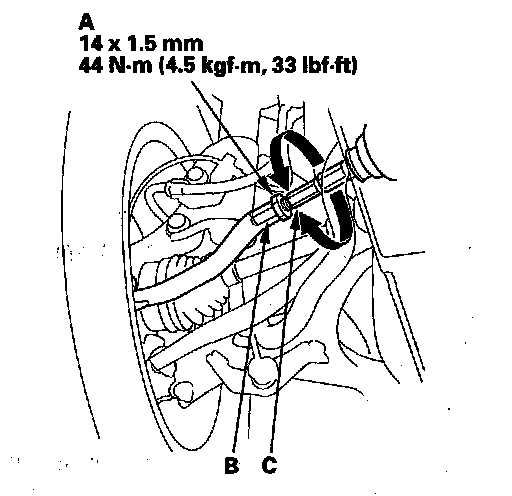3. Loosen the tie-rod locknuts (A) while holding the flat surface sections (B) of the tie-rod end with a wrench, and turn both tie-rods (C) until the front toe is within specifications.