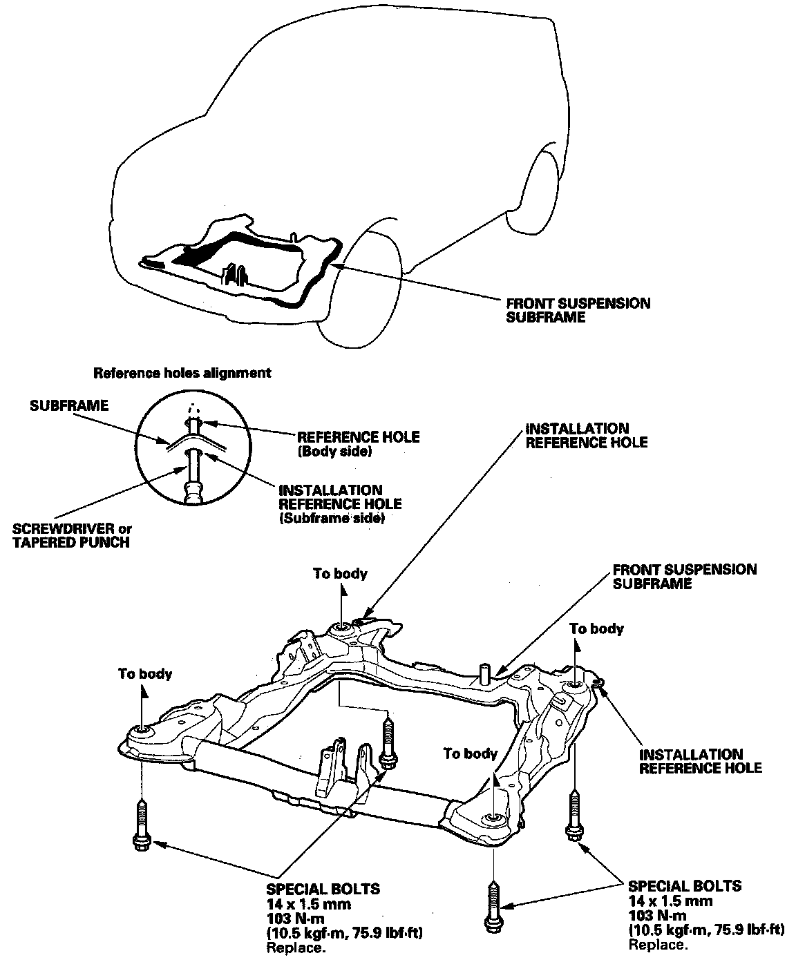 - When installing, align both installation reference holes in the subframe with both reference holes in the body using a screwdriver or tapered punch as a guide.